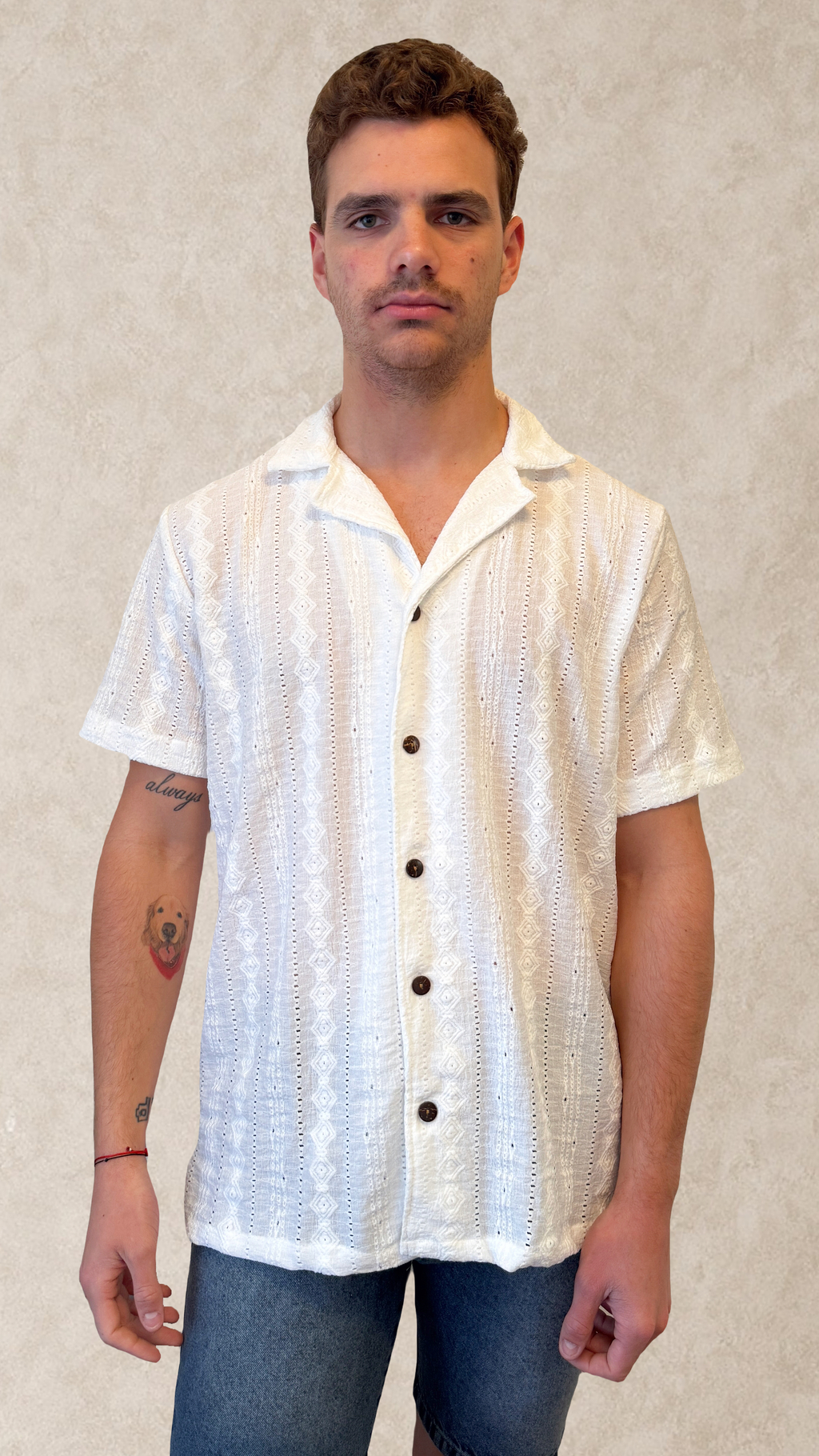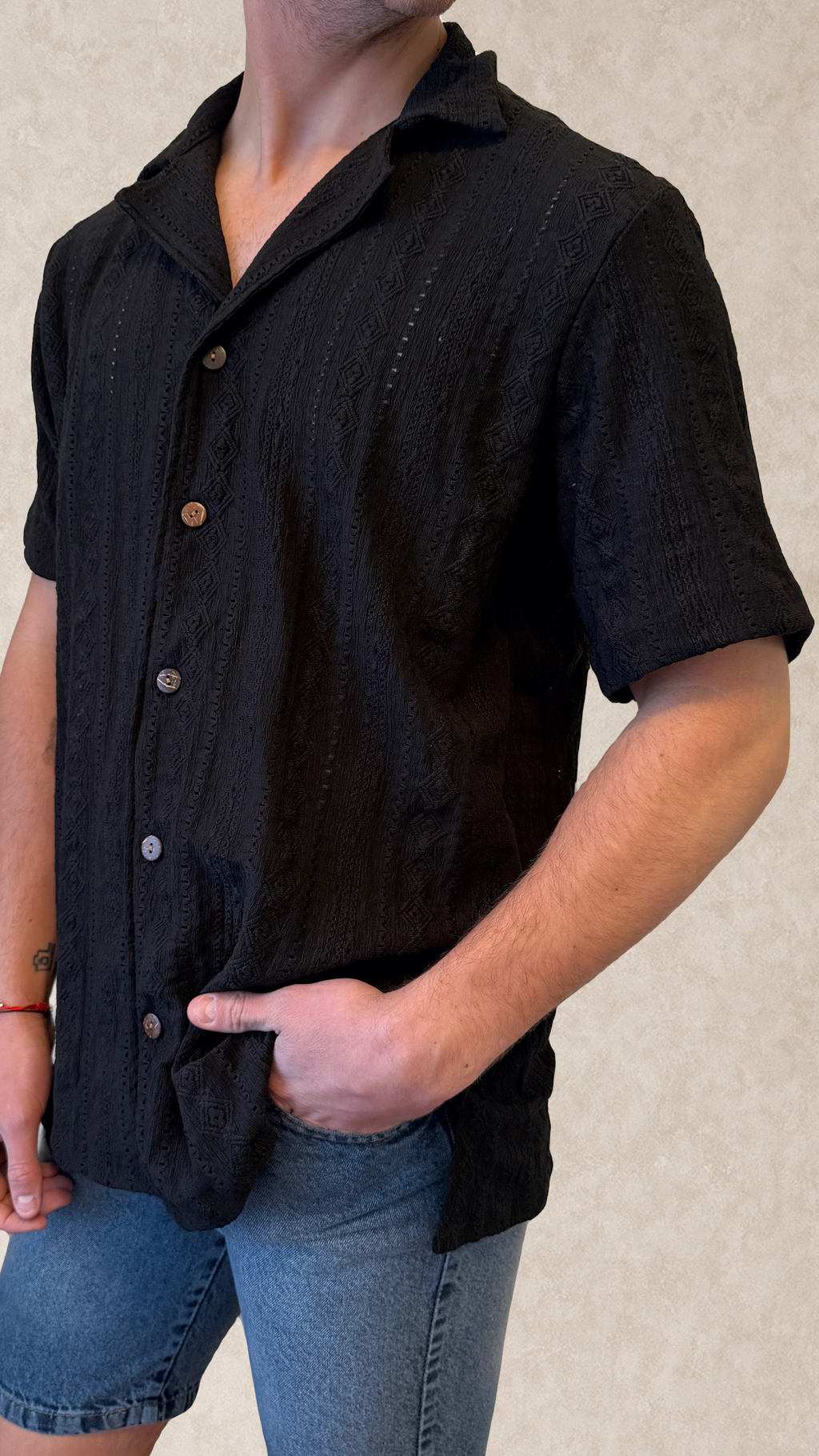 Camisa de manga corta con textura étnica y botones frontales. Fresca, liviana y versátil, ideal para el verano y disponible en 4 colores para crear looks relajados con estilo.